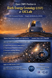 The candidate is expected to play an active role in LSST science collaborations and to contribute to the scientific leadership of dark-energy analyses within IJCLab.